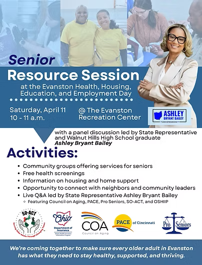 Join us at the Senior Resource Session at the Evanston Health, Housing, Education and Employment Day. This event offers a panel discussion by State Rep and Walnut Hills graduate Ashey Bryant Bailey.